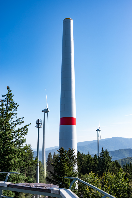 Die Roßkopf-Silhouette hat sich geändert: Die fertigen Betontürme der Windräder ragen zu diesem Zeitpunkt schon in den Himmel: der Turm der „WEA 1“ (WindradEnergie-Anlage, Gemarkung Freiburg-Ebnet) sowie der der „WEA 2“ auf der Gemarkung Gundelfingen.