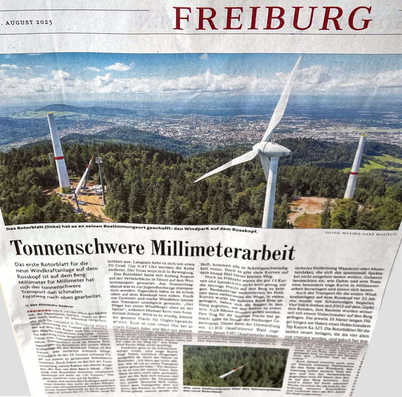 Die abschließende „Fahrt“ der Rotorblätter hinauf zum Roßkopf ist hier nicht mehr mit Fotos dokumentiert. Dazu verweise ich auf den Artikel in der Badischen Zeitung vom 30. August 2025 von Alexandra Röderer. In ihm wird die Auffahrt des ersten der sechs Rotorblätter durch den Wald von der Freiburger Jugendherberg bis zum Roßkopf sehr detailliert und anschaulich beschrieben. Zusätzlich gibt es einige technischen Erläuterung, die auf dieser Web-Site nicht zu finden sind.