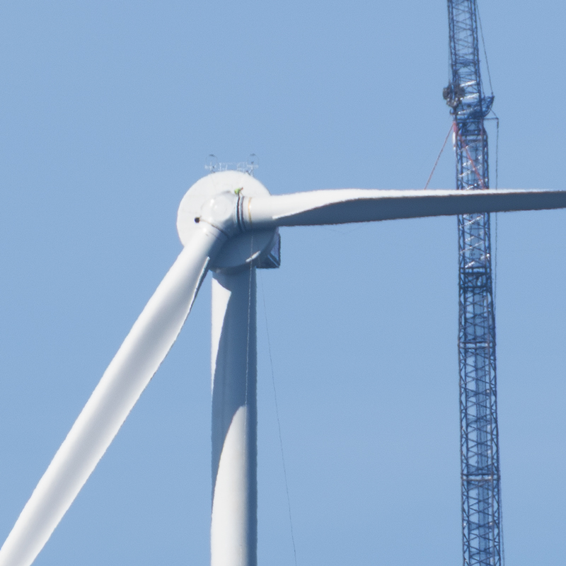 war nicht nur ein Rotorblatt schon montiert, ein zweites hing waagrecht am Kran, war langsam auf die Höhe des Blattadapters gehoben worden und hing nun in seiner Nähe.