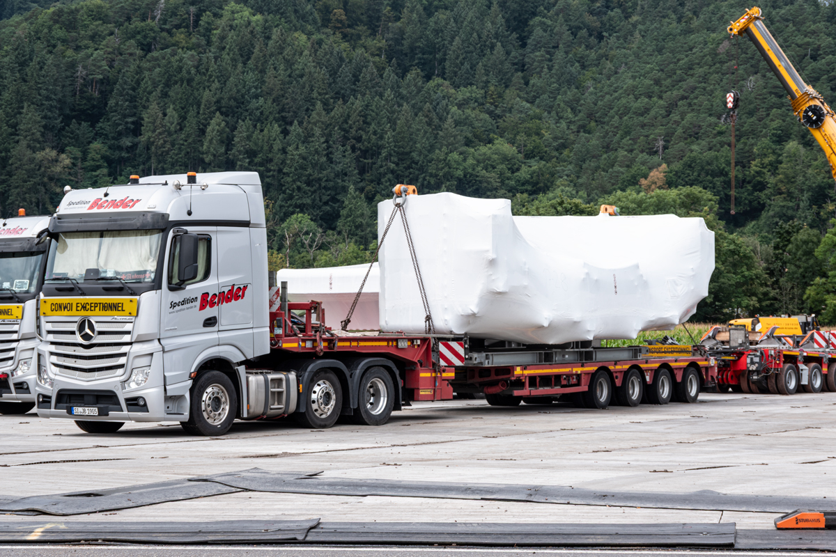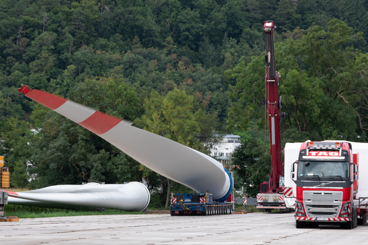 (Fotos unten aufgenommen am 9. August 2025). Dann werden die Windradkomponenten mit sogenannten Selbstfahrern zur Windenergie-Anlage auf den Roßkopf gebracht. So jedenfalls zieht nach der Anlieferung der Plan aus.