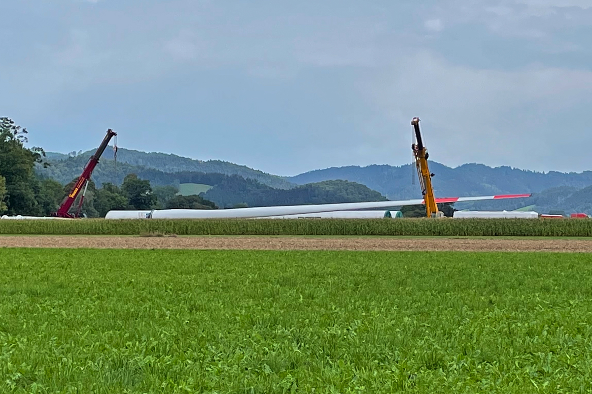 Auf dem Platz der WEA1 am Roßkopf: Die drei Rotorblätter unter dem Windradturm, bereit zur Montage. (Foto: Uwe Rolke)