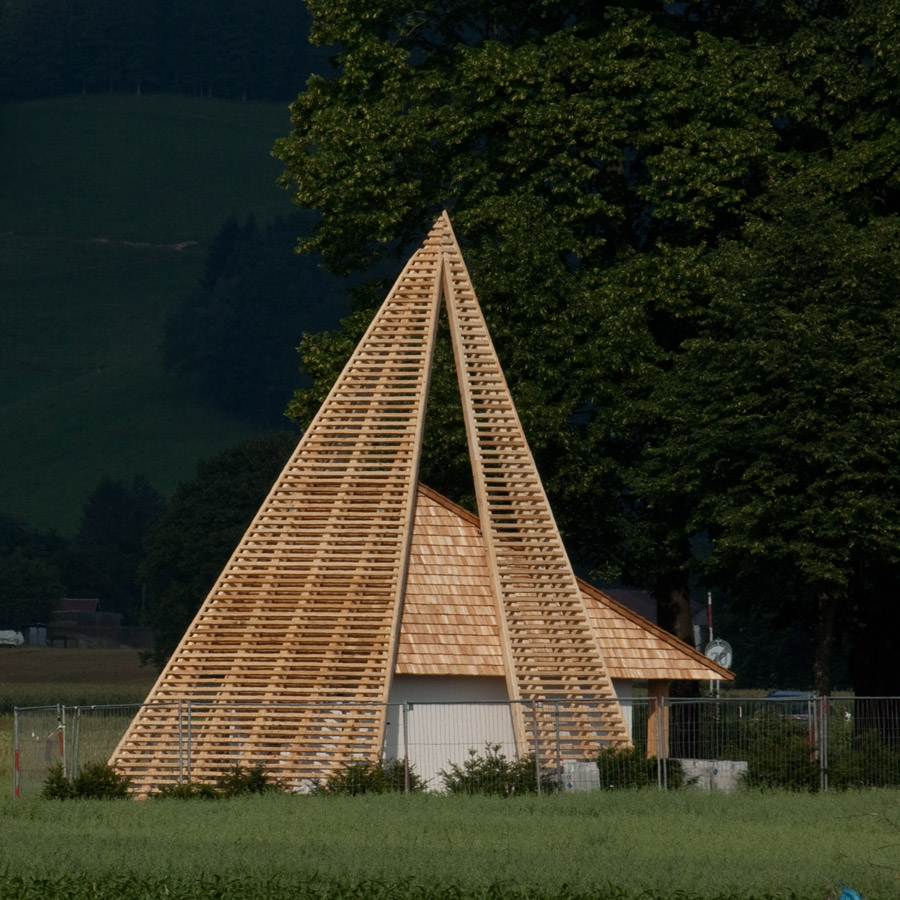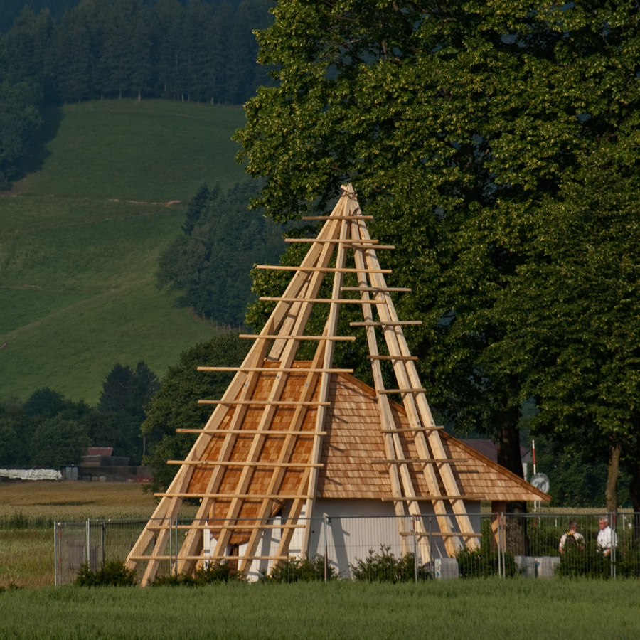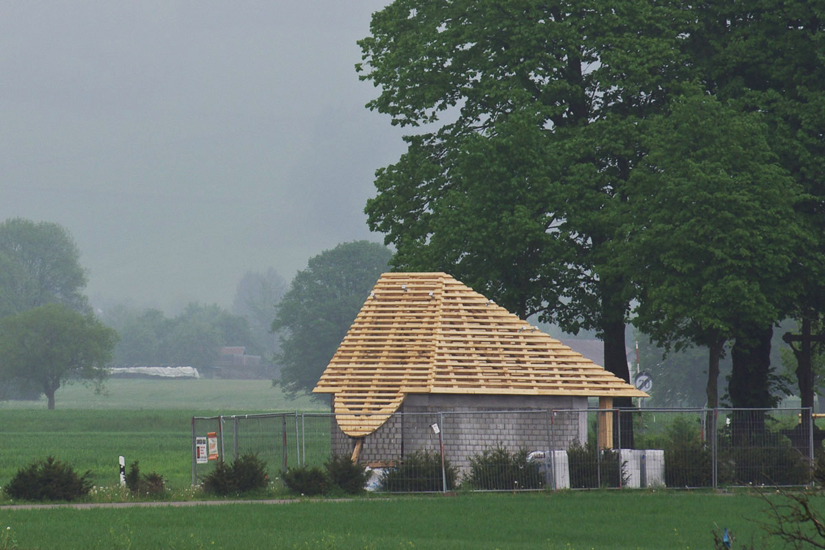 Kapelle mit Dachsparren im Morgendunst,