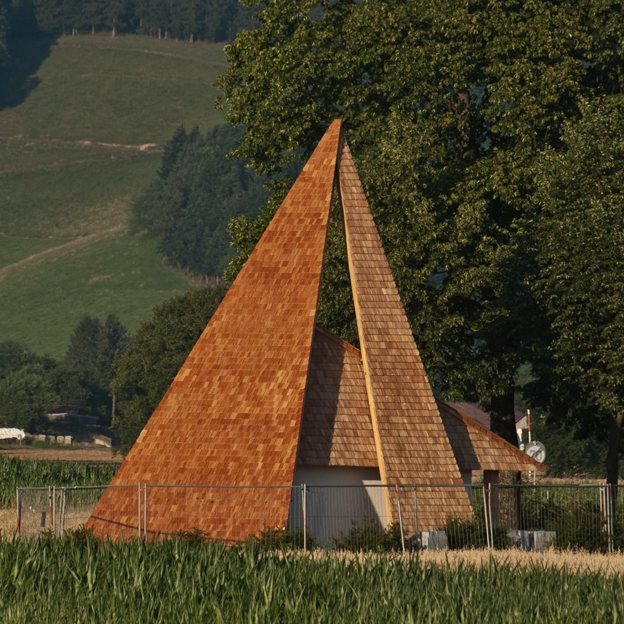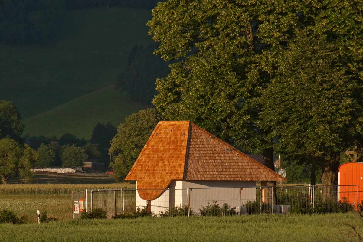 Kapelle, Dach mit Holzschnindeln gedeckt, im Abendlicht,