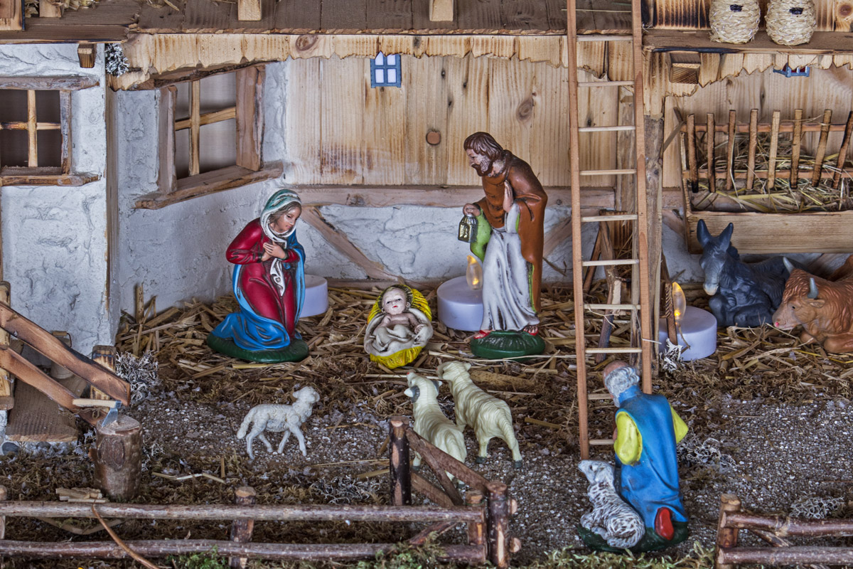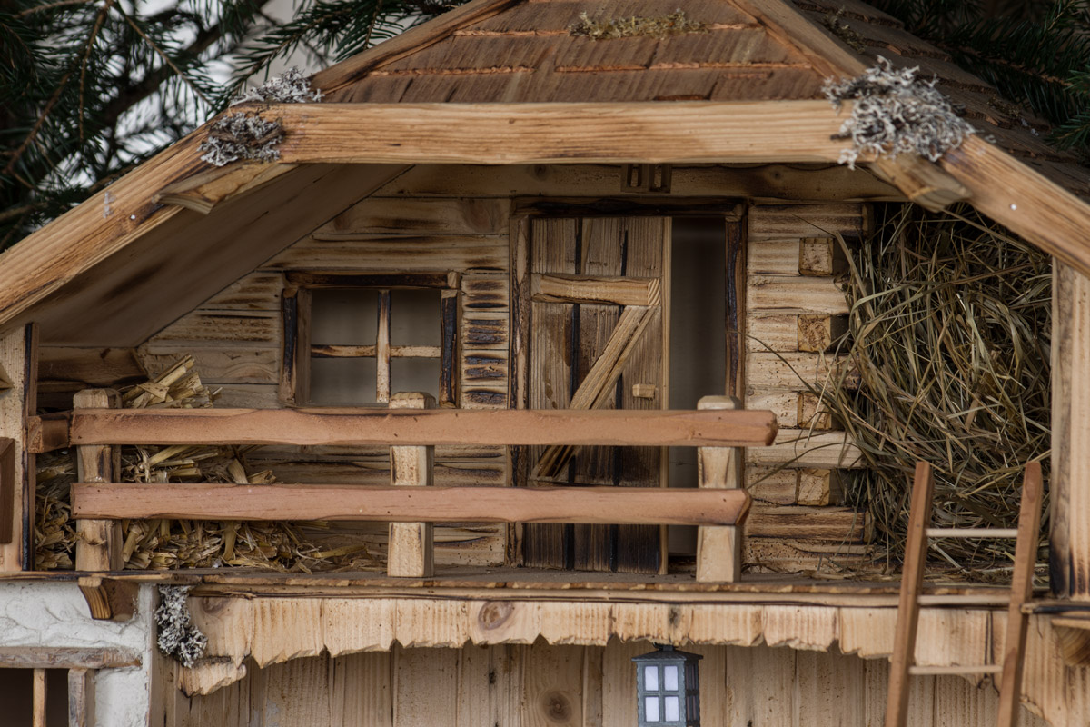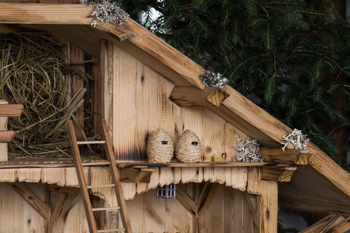 Liebevoll und mit vielen Details ausgestattet steht auf einem moosbedeckten Hang ein Gehöft: im Zentrum des Hauses die heilige Familie, rechts davon der Stall mit Ochs und Esel, links davon ein gemauerter Raum mit halb offener Tür und zwei Fenstern. Alles unter einem Dach.