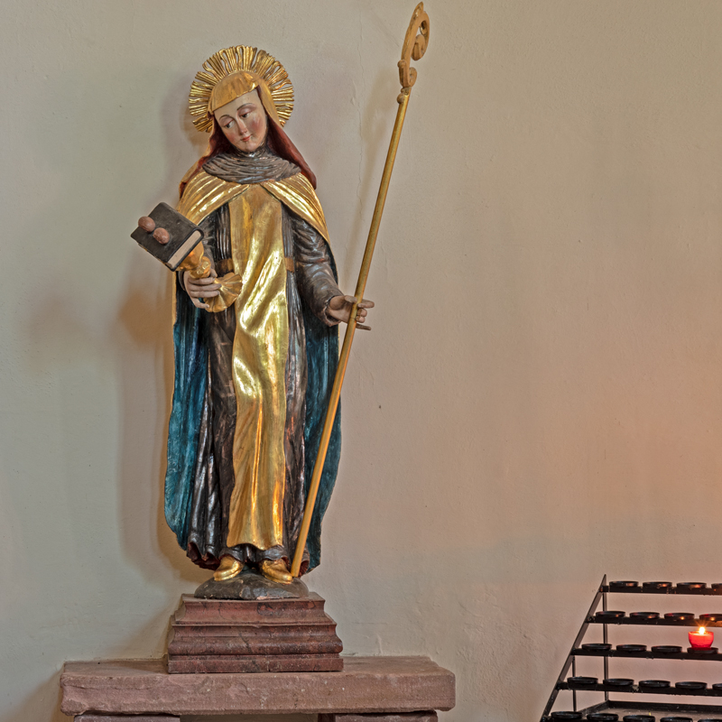 (*um 660, †720) geschaffen 1666, vermutlich gefertigt vom Schnitzer der Altarplastiken. Der Krummstab, den sie in der linken Hand hält, weist sie als Äbtissin aus; der Kelch mit Buch und den zwei Augen weist darauf hin, dass sie blind geboren wurde.