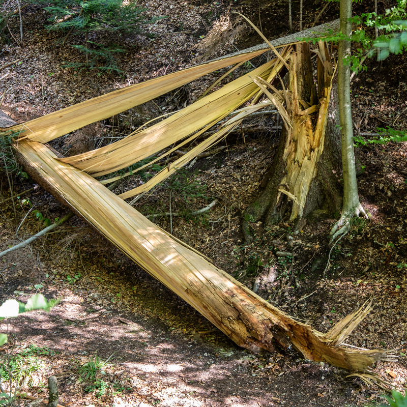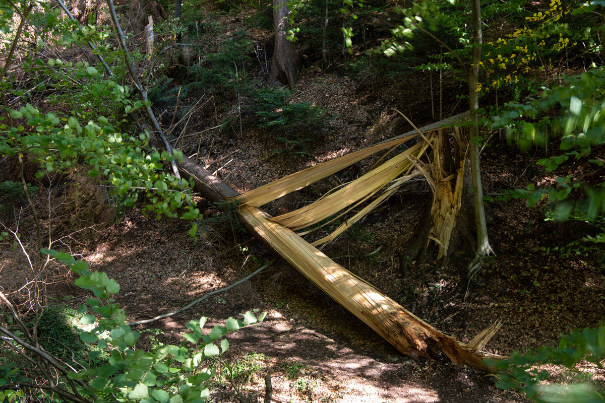 4. 10. 2022: Am Gegenhang zum Wanderpfad eine zusammengebrochene, hohe Fichte mit gesplittertem und teilweise entrindetem Stamm. Die Spitze des Baums liegt hangaufwärts langgestreckt zwischen Waldbäumen.
