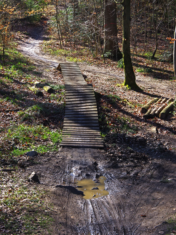 Ausschnitte der recht flachen Mountainbike-Strecke, damals 2018, teilweise mit Holzbohlen belegt. Der Waldpfad für Wanderer, der westlich parallel zur Mountainbike-Strecke zum Roßkopfsattel führt, trifft an der fotografierten Stelle auf die Mountainbike-Strecke.