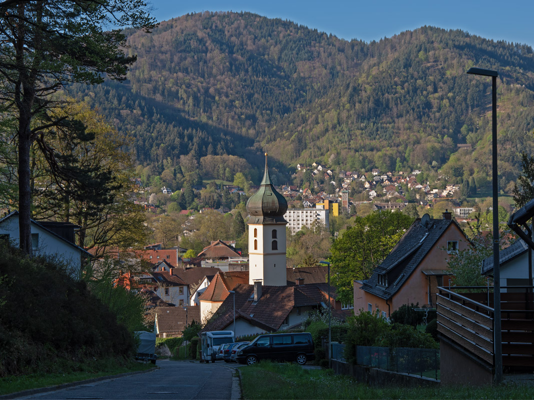 Blick den Scheibenbergweg hinunter zum Turm der Ebneter Pfarrkirche St. Hilarius bis hinüber nach Littenweiler mit den bewaldeten Höhen des Schwarzkopfs (837m) und des Rehagkopfs (757m).