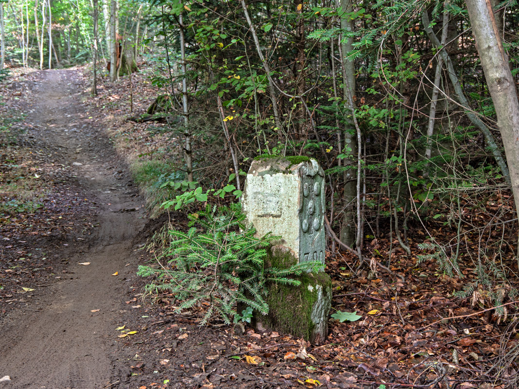 Foto rechts: Es zeigt den dritten Grenzstein, zu sehen ist das Wappen der Herrn von Sickingen. Der Stein steht östlich der „Borderline“-Strecke, direkt neben ihr.