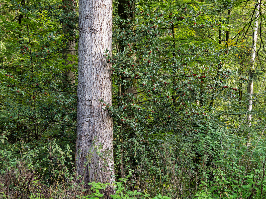 Auffällig das kräftige Grün der Efeu-Blätter an Baumstämmen. Der Efeu klettert die Stämme weit hinauf und wurzelt an ihnen.