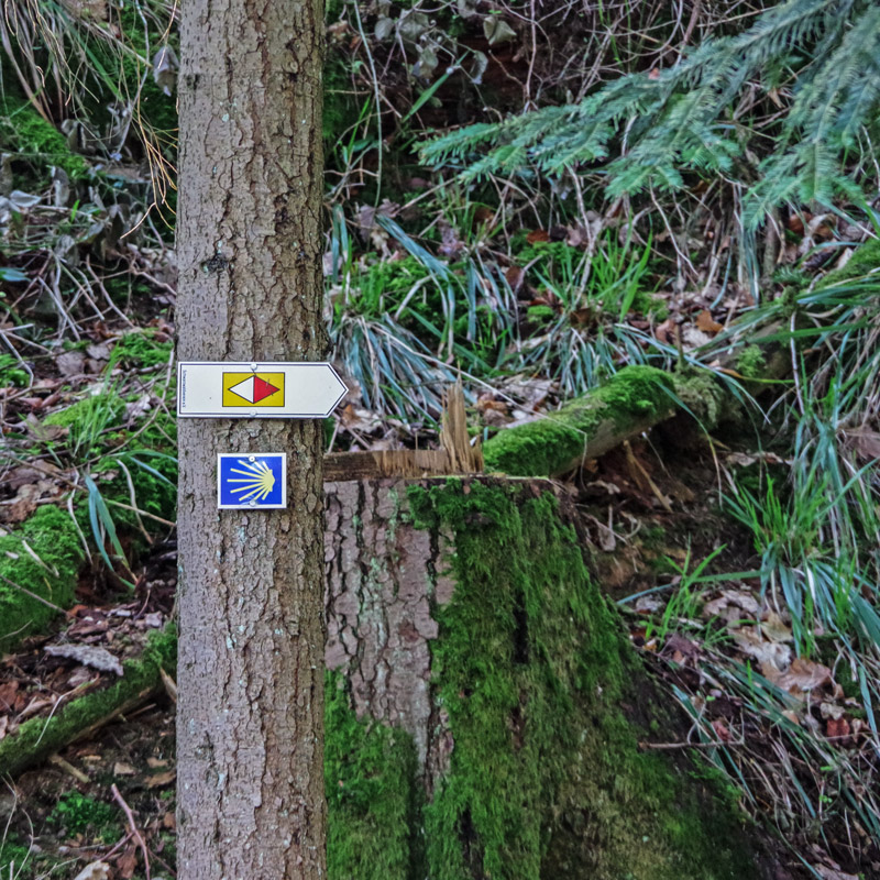 Gelbes Signet auf blauem Grund: Wander-strecke eines Jakobswegs – Abschnitt Himmelreich-Freiburg