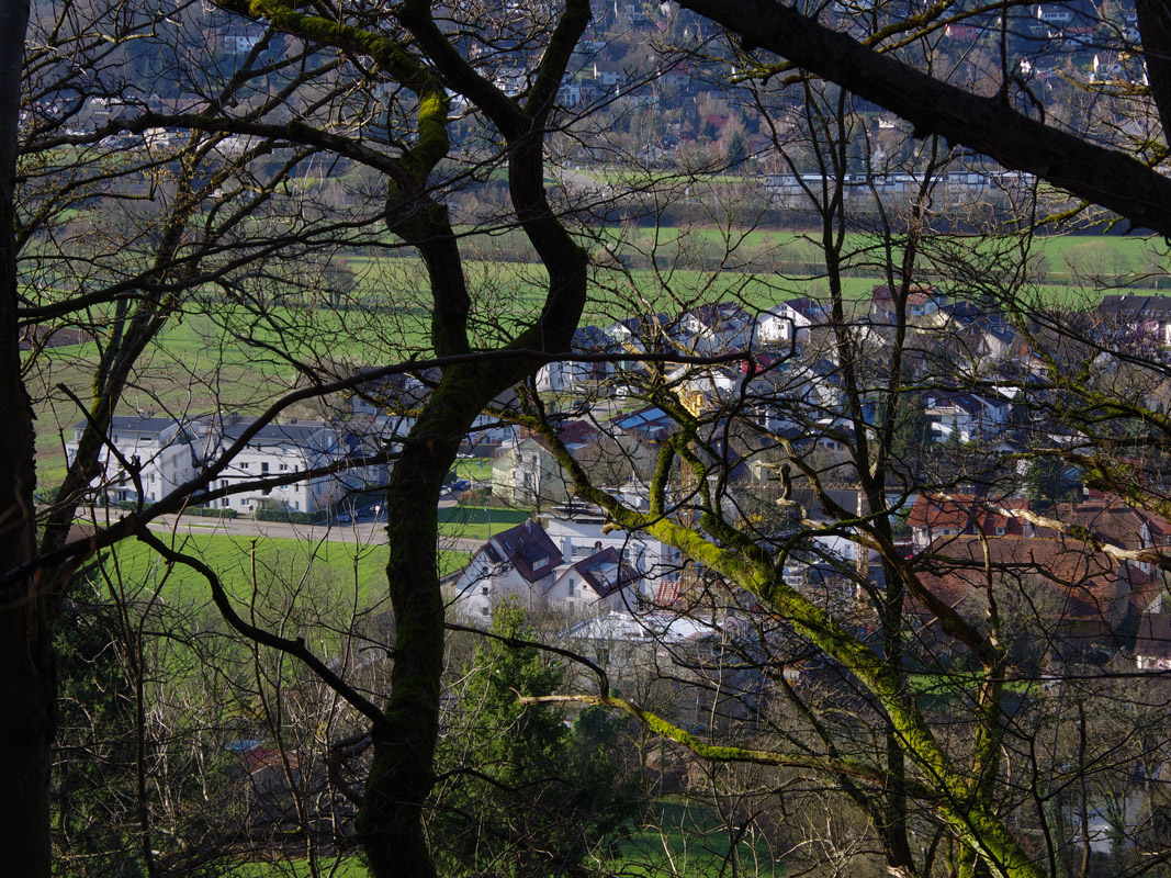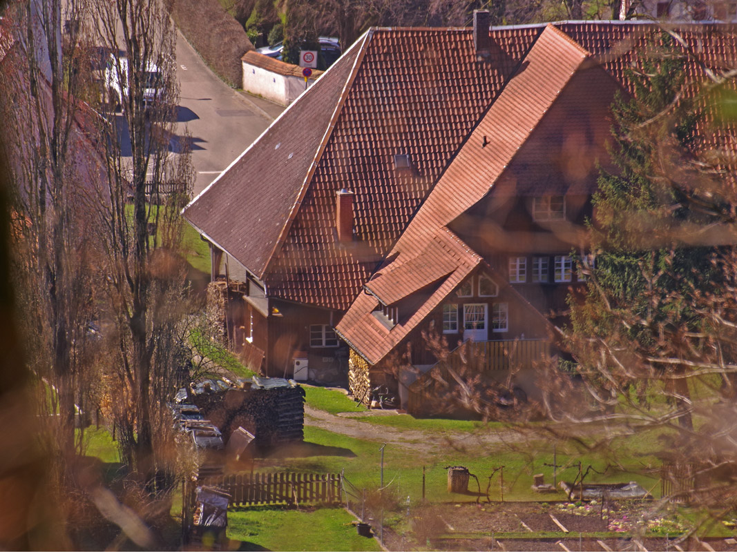 Zwischen den kahlen Zweigen hindurch entdeckt man im Tal den „Hinterhof“ des Hättichenhofs. Der Hof liegt an der Schwarzwaldstraße gegenüber der Einmündung der Bruggastraße.