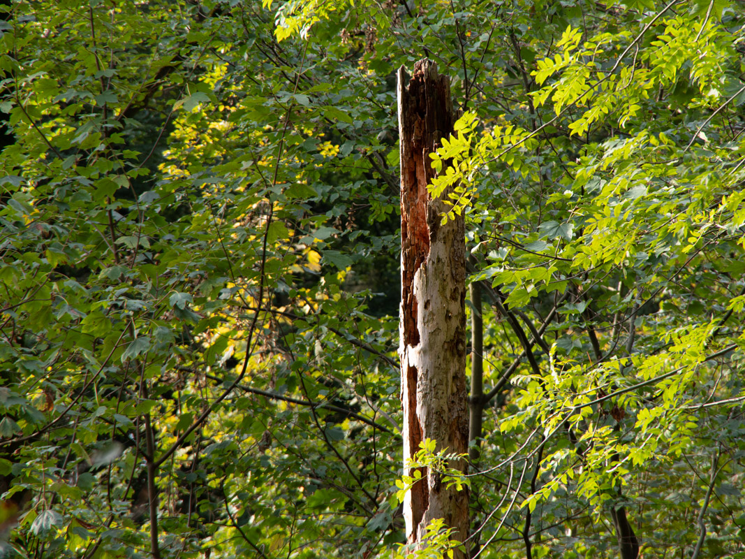 Totholzstamm zwischen grünen Laubbäumen unterhalb des Pfads