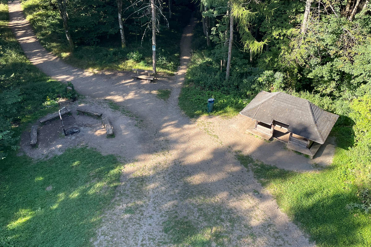 Auf dem Turmvorplatz sieht man neben der Hütte den Grillplatz und am Platzende eine Weggablung. Der linke Weg führt zum Beginn der Borderline-Strecke. Er verläuft auf dem Kamm mit der Gemarkungsgrenze zwischen Freiburg und seinem Stadtteil Ebnet. Der rechte Weg führt auf den Kamm, der Richtung Freiburg-Schlossplatz abfällt.