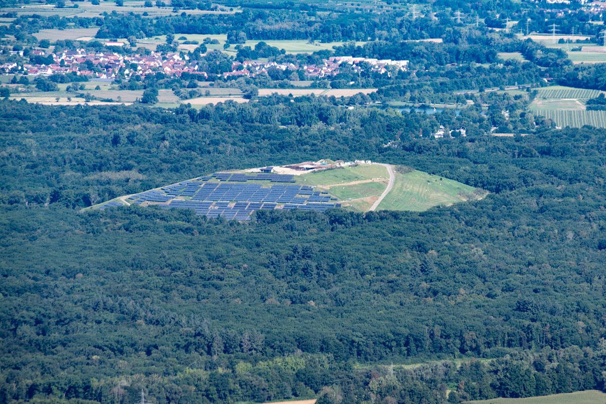 Foto rechts: Der Eichelbuck (ehemaliges Deponiegelände) mit der Solaranlage Eichelbuck, dahinter Häuser von Vörstetten.