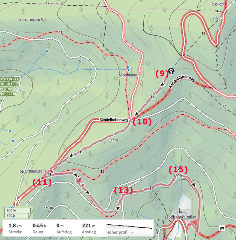der Kammlinie ab, die nach Südwest zum Freiburger Schlossberg hinunter führt. Von dieser Kammlinie biegt man nach rund 1,3 km ab, um in den Ottilien-Dobel abzusteigen. Auf schmalem Weg umrundet man dabei das Tal-Ende, um wieder auf den Weg zu kommen, den man von Parkplatz bei St. Ottilien aus die Tour begann.