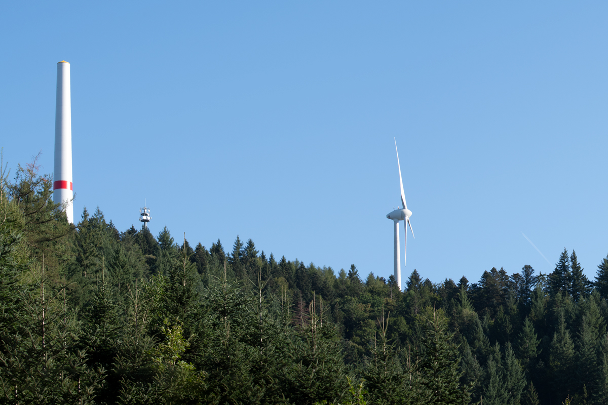 Repowering der Windenergie-Anlage Roßkopf: zwei der alten, noch stehende Windräder aus dem Jahr 2003 und der Betonturm eines neuen Windrads. Er steht am Platz eines schon gesprengten alten Windrads. Unbeteiligt der Funkmast, ganz links im Bild.