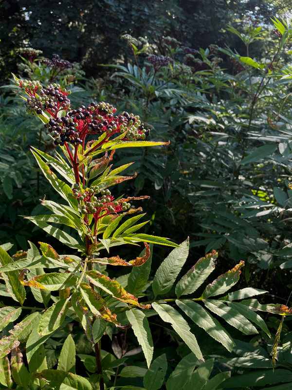 Neben dem Pfad Fruchtstand des Schwarze Holunders (Sambucus nigra)
