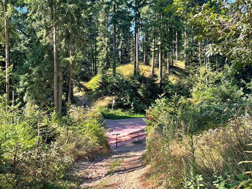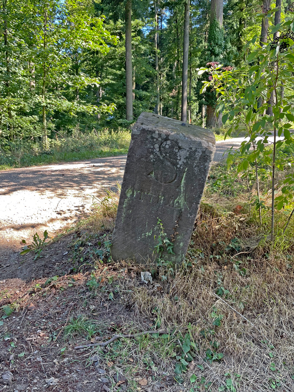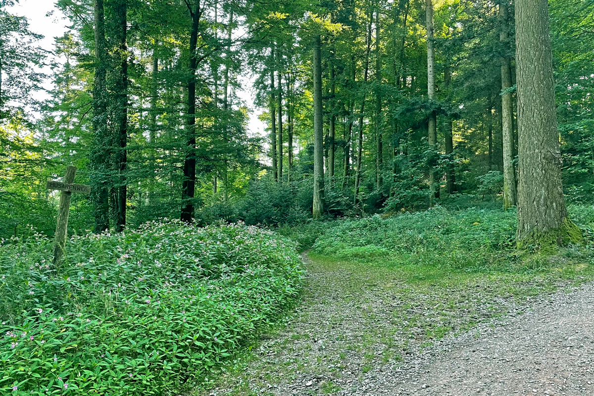 Auf dem „Husarenweg“, so zeigt es der Wegpfosten an dem breiten Forstweg – (7), von dem man kommt. Zu finden ist der Weg-Name noch auf dem Freiburger „Amt-lichen Stadtplan, Ausgabe 2010“ von 11/2009, bei der Internetsuche outet er sich als „Der Abschnitt Freiburg - St.Peter des Kandel-Höhenwegs …“ (https://freiburg-schwarzwald.de/wandern.htm, Zugriff September 2025). Auf den aktuellen Karten taucht er nicht mehr auf – also ein historischer Name?