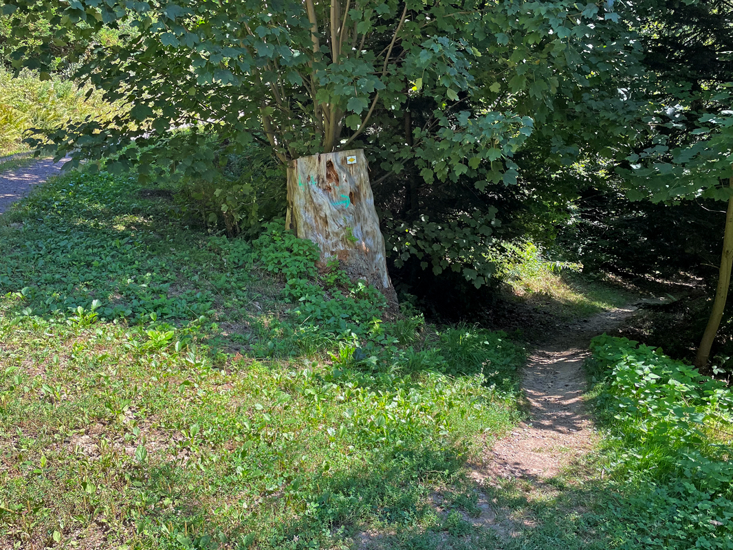 Der Pfad hinunter zur Wallfahrtskapelle quert einen Forstweg. Es ist der „Obere Abfuhrweg“, den man beim Aufstieg – Abzweigung zum „St.Wendelinweg“ – schon einmal überquert hat. Danach überquert man einen weiteren, schmaleren Weg, den Schokoladenweg: An einem ebenfalls durchlöcherten, jedoch rindenlosen Baumstamm ist eine Wegmarkierung angegeben, dieser folgt man.