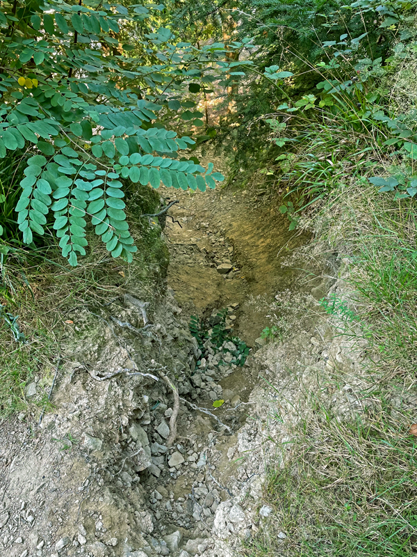 Die ausgewaschene Abkürzung hinunter zum Parkplatz am oberen Ende der Ottilienstraße ist vom Beginn der Wanderung her schon vertraut.