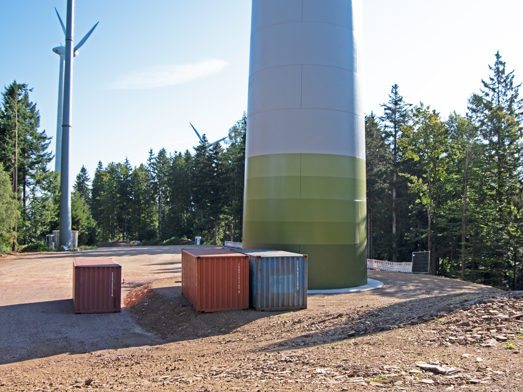 aufnehmen: Von der Ebene des Roßkopfturms – auf ihm liegt noch ein Abraum-Hügel, blickt man eine Stufe tiefer auf den Fuß des aufgestellten Windradturms und auf drei Container.