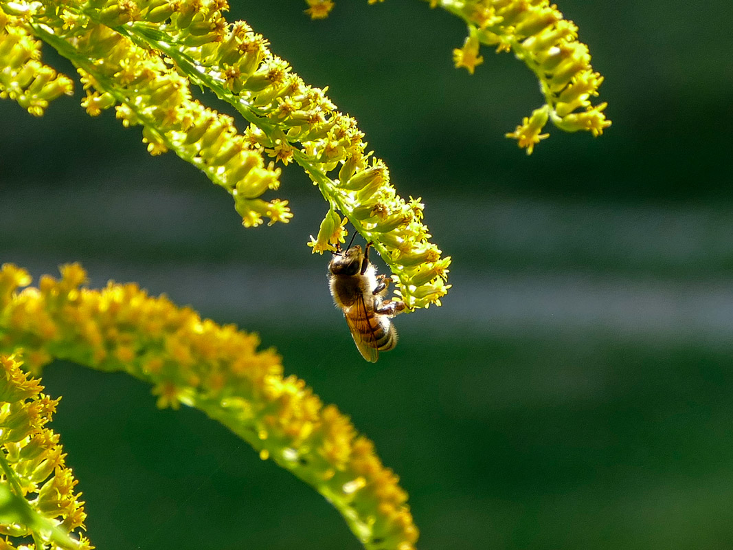 Rispenzweige mit Blütenkörbchen; auf dem rechten Foto und seinem Ausschnitt "erntet" eine Biene