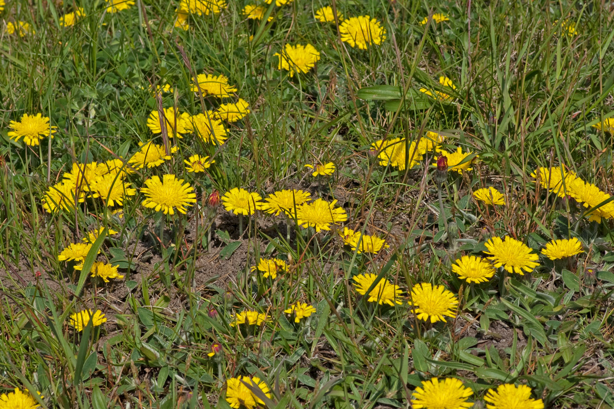 Wiesenstück auf dem Gelände von Klappholttal, Sylt, mit Kleinem Habichtskraut - Hieracium pilosella.