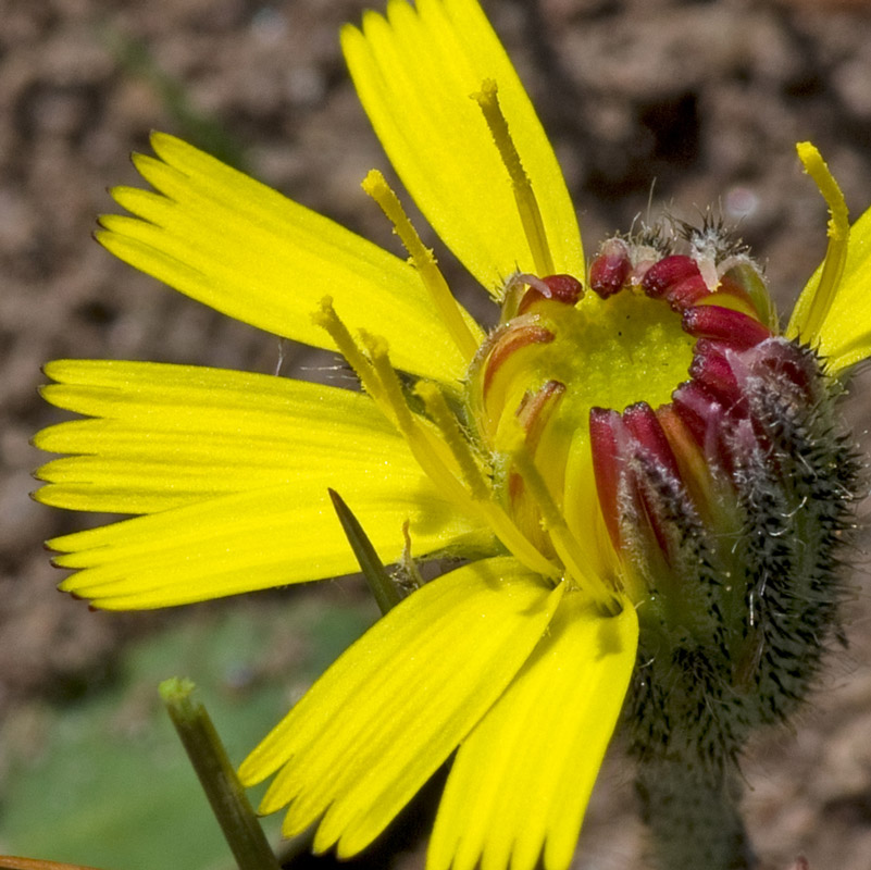 Einzeln stehende, gelbe Blütenkörbchen mit Zungenblüten; Randblüten-Unterseite oft orangerot; Blüten nur tagsüber bis etwa 15 Uhr geöffnet; Hüllblätter 1 bis 2 mm breit, spitz zulaufend, mit schwarzen Drüsenhaaren.