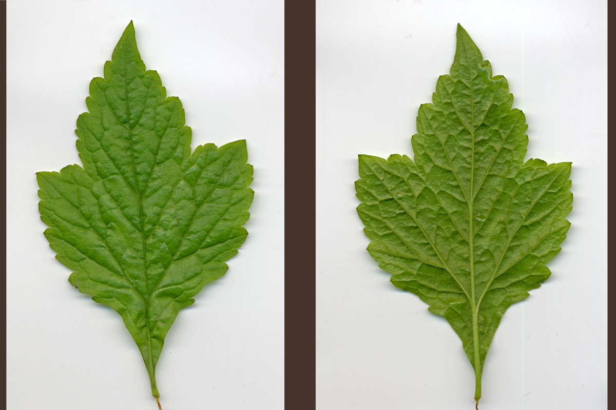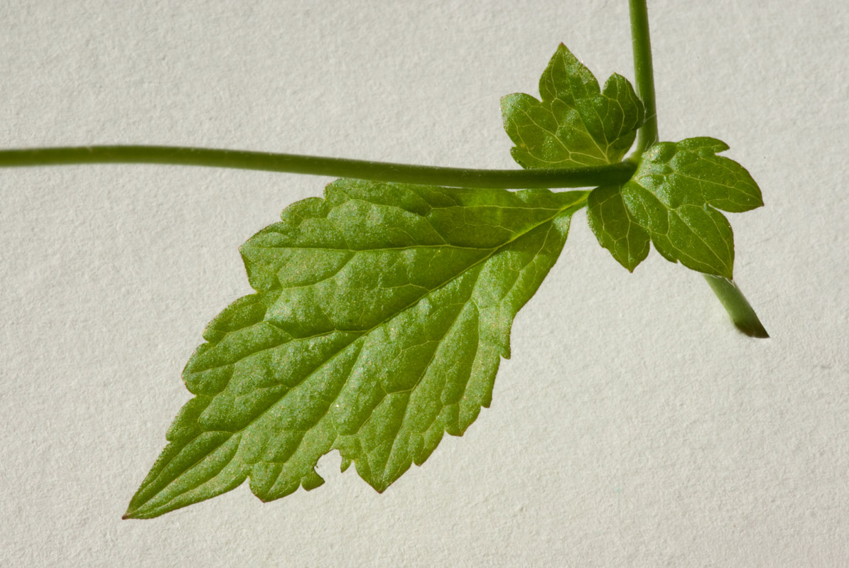Rechts die Ober- und Unterseite des gestielten Blatts vom linken Bild. Länge vom Blattansatz der unteren zwei Blätter bis zur Spitze des oberen Blattes ca. 7 cm.