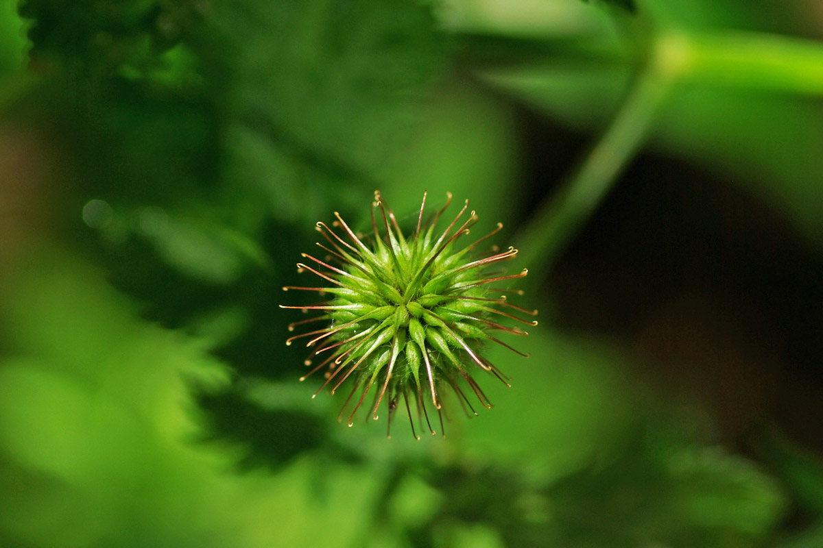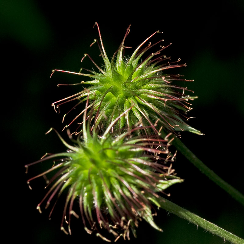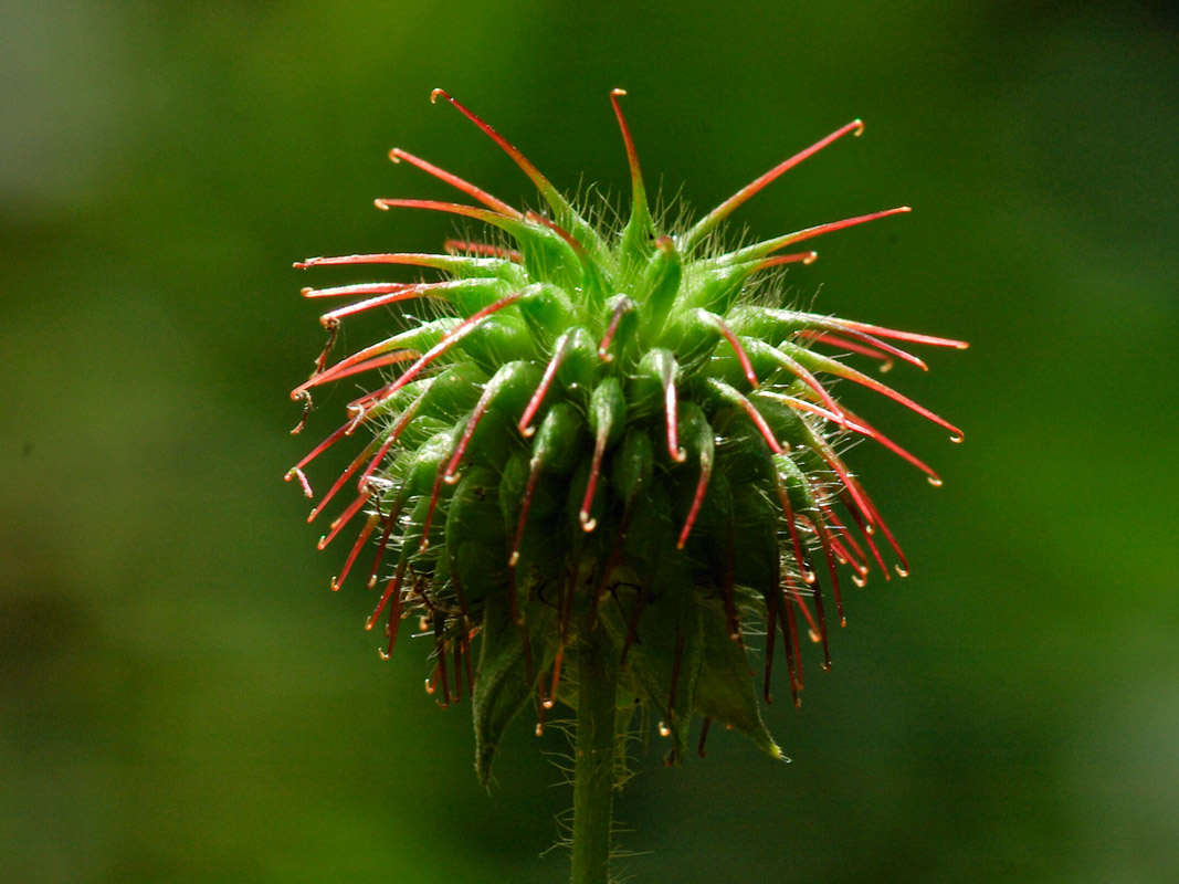 Fruchtstand einer Echte Nelkenwurz (Geum urbanum): flache, behaarte Nüsschen mit hakenförmigen Granne