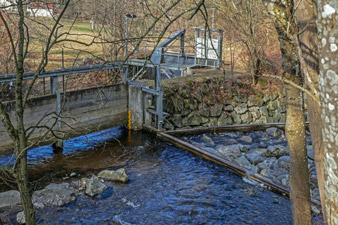 Im Vordergrund jeweils das Bett des Rotbachs; die breiten Stellfalle steuert den Auslauf des Rotbachwasser, hinter der Stellfalle fließt das Wasser weiter in die Rohrleitung.