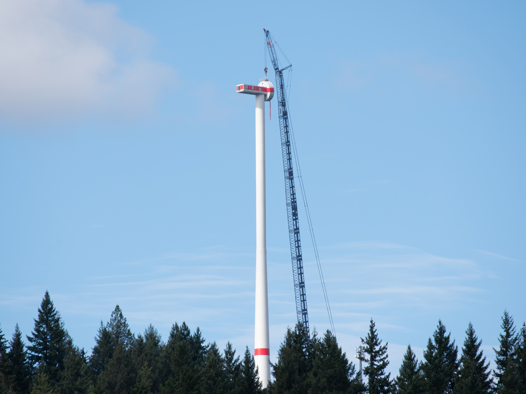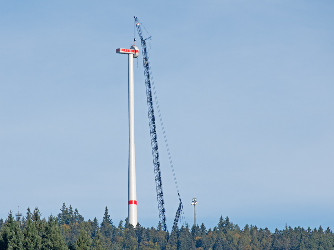 Aus der „Ferne“ ist die schrittweise Vervollständigung des neuen Windrads zu beobachten: Auf den Betonturm werden nacheinander die zylinderförmigen Stahlsektionen und schließlich die Gondel mit dem dreiflügelige Rotor aufgesetzt.