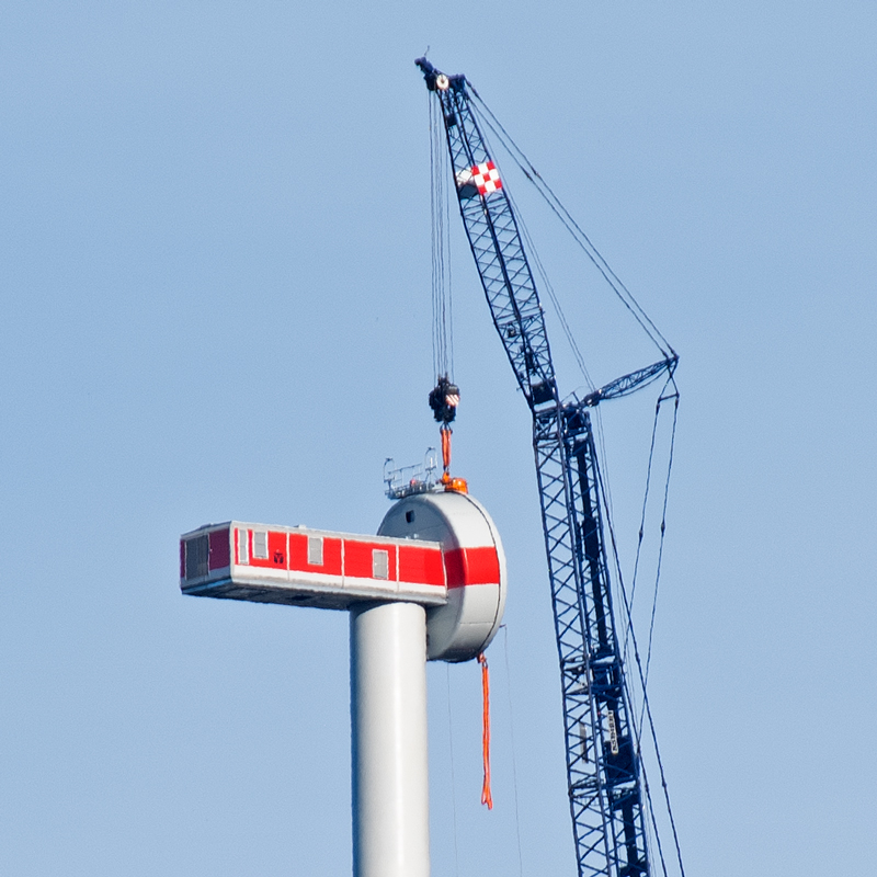 Die Gondel – das Maschinenhaus der Windenergie-Anlage – wird aufgebaut.