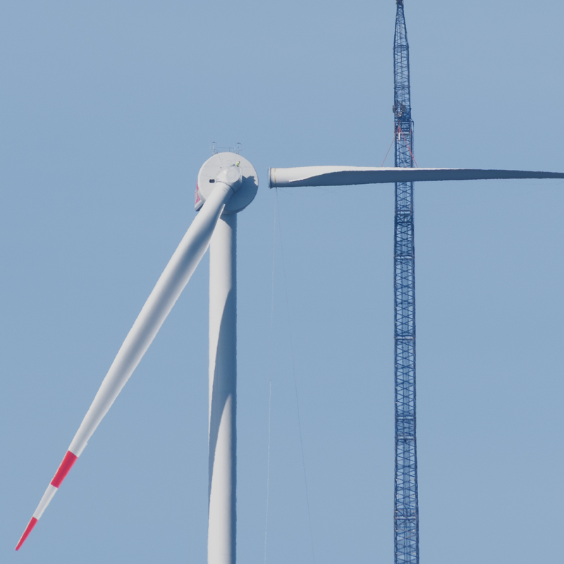 war nicht nur ein Rotorblatt schon montiert, ein zweites hing waagrecht am Kran, war langsam auf die Höhe des Blattadapters gehoben worden und hing nun in seiner Nähe.