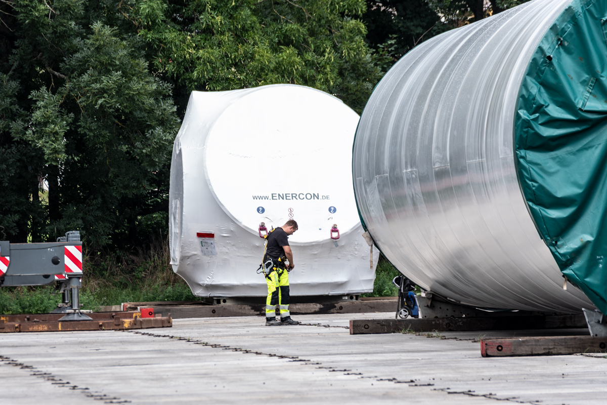 Bis Ende August / Anfang September stehen die drei Rotorblätter und die drei zylinderförmige Stahlsektionen des Windradturms auf einem mit Aluminium-Platten abgedeckten Feld, der Umladefläche, am Ortsausgang von Ebnet