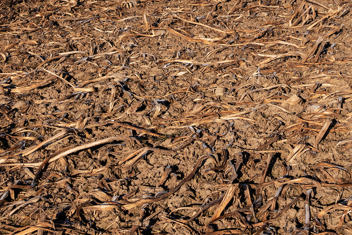 Bei der fotografierte Feldbearbeitung werden die Reste der nicht winterharten Pflanzen untergepflügt. Pflanzen, die im Vorjahr zur Gründüngung auf dem Feld angepflanzt waren.