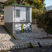 Scheibenbergbrunnen: Brunnen im Vorbau des Scheibenberg-Hochbehälters im Freiburger Stadtteil Ebnet. Seit Sommer 2023 gehört der Brunnen zur Liste der „Trinkwasserbrunnen“ des Freiburger Wasserversorgers badenovaNETZE.