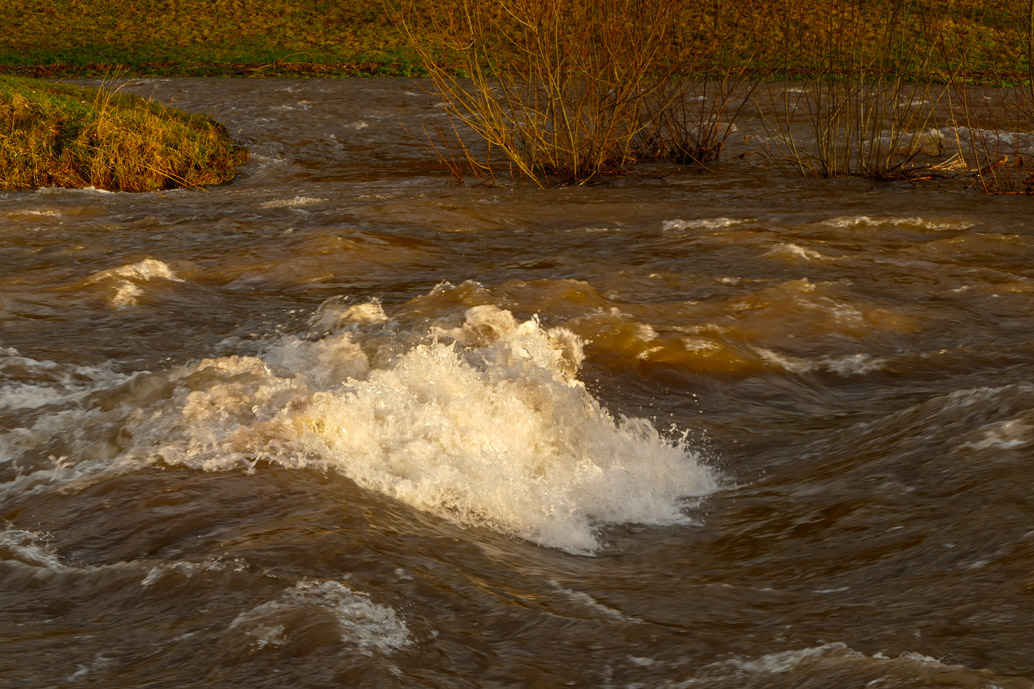 Auf dem mittleren, oberen Foto ist deutlich der Abfall des Wasserstandes von seiem Höchststand in der Nacht, gegen 3 Uhr in der Frühe, von Donnerstag auf Freitag, den 5.1.2018, zu erkennen. Die Linie der angetriebene Gras und Holzteile auf dem Uferrand zeichnet den Rand des breiteren Wasserbettbeim beim Höchststand in der Nacht nach.