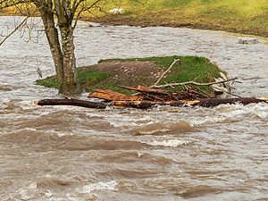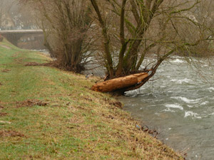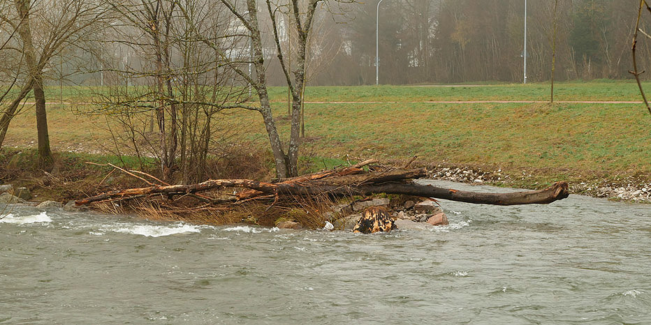Angetriebenes Holz am Dreisam-Südufer zwischen Ebneter Schlosssteg und Ebneter Nepomukbrücke
