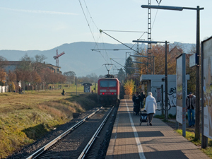 Blick dem Gleis entlang in Richtung Freiburg-Wiehre; Einfahrt des Zuges von dort; Zug-Halt, Aus- und Einsteigen