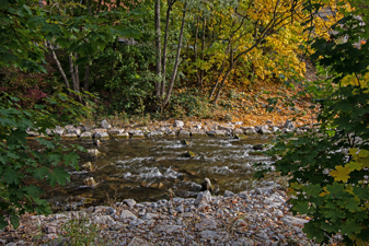 Um die Durchgängigkeit im Messbereich auch für Fische und andere Lebe-wesen zu erhalten, ist unterhalb des Messbe-reichs in der auslaufende Rinne eine Raue Rampe gestaltet: eine große An-zahl von aufrecht ste-henden Felssteinen und Unebenheiten ist einge-bracht.