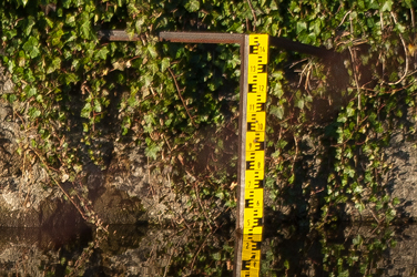 Wasserstand abgelesen an der Pegellatte, die an der Treppe hinunter zur Flusssohle angebracht ist: