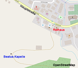 In Buchenbach führt zwischen dem Rathausparkplatz und dem Rathaus von der Hauptstraße ein Wirtschaftsweg den Wiesenhang aufwärts. Er verläuft zunächst nach Süden und biegt dann nach Westen parallel zum Hang ab, bis er wieder eine kräftige Linkskehre macht. An der Spitze der Kehre steht die Beatus-Kapelle – eine kleine Hofkapelle aus dem Jahr 1998.