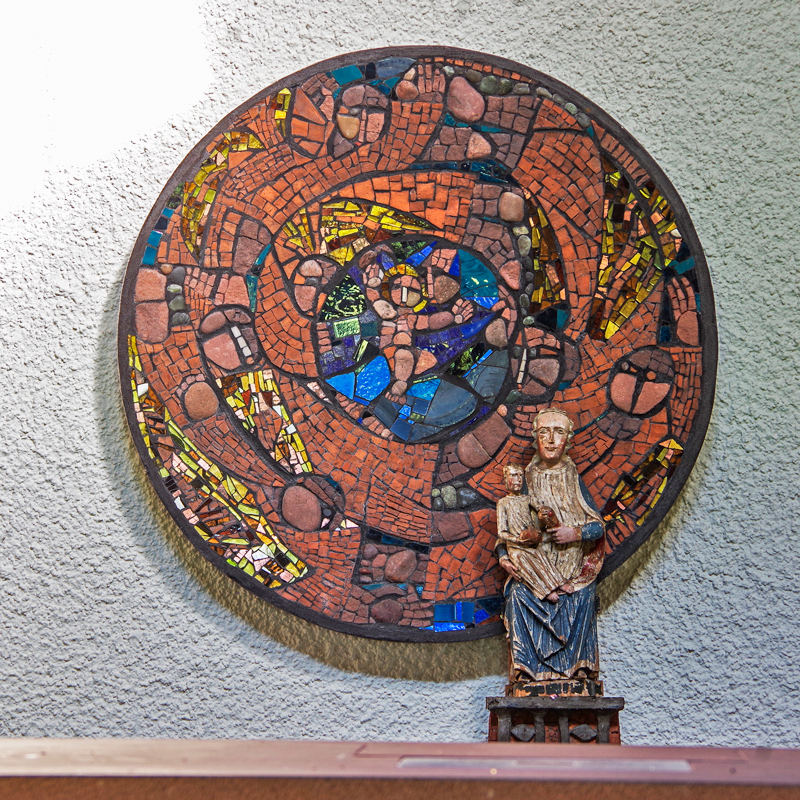 An der Kapellenrückwand hängt ein Mosaikschale, gestaltet von Hans Baumann, davor steht auf einem Sockel eine Marienstatue – eine alte Nachbildung des Gnadenbildes von Maria Zell in der Steiermark.