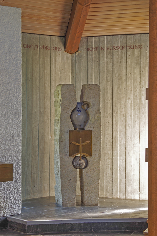 Im Zentrum des Kapellenraums steht der aus rötlichem Standstein gearbeitete Altar unter der Lichtkuppel des Turmhelms, abgestützt durch sechs Holzsäulen, an jeder ein bronzener Kerzenhalter. Sie „tragen Ähren und Weintrauben als Symbole für die eucharistischen Gaben Brot und Wein“ [Oratio dominica].