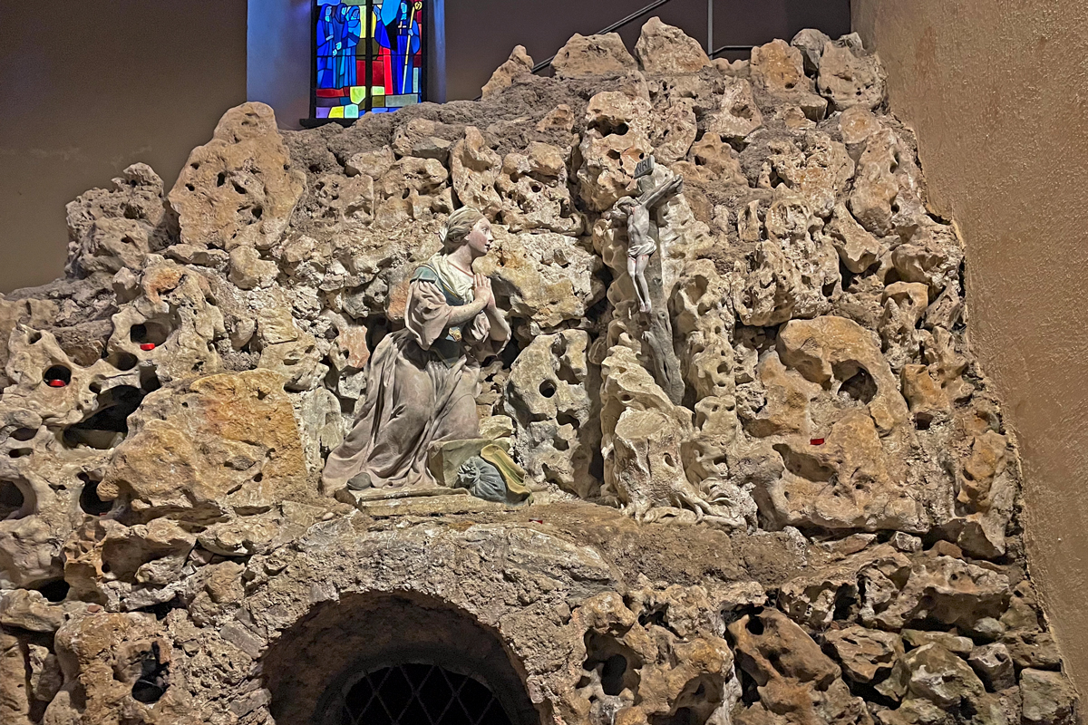 Dem Eingang gegenüber steht eine farbige Steinskulptur der hl. Ottilie