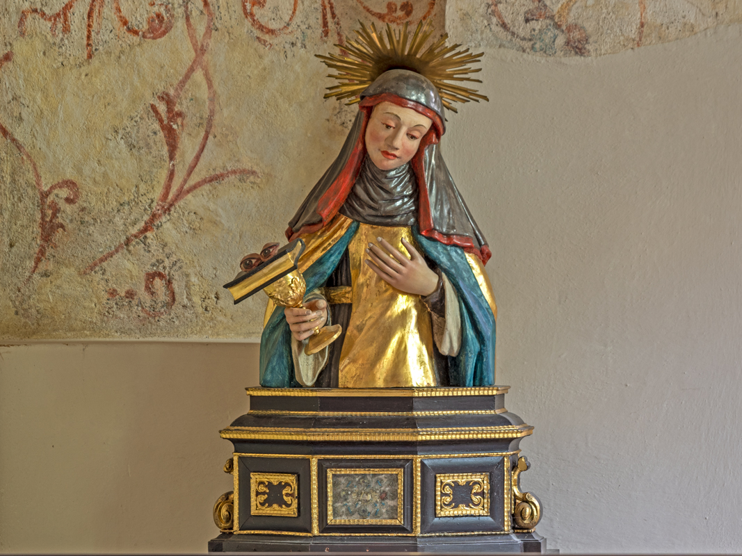 (*um 660, †720) geschaffen 1666, vermutlich gefertigt vom Schnitzer der Altarplastiken. Der Krummstab, den sie in der linken Hand hält, weist sie als Äbtissin aus; der Kelch mit Buch und den zwei Augen weist darauf hin, dass sie blind geboren wurde.