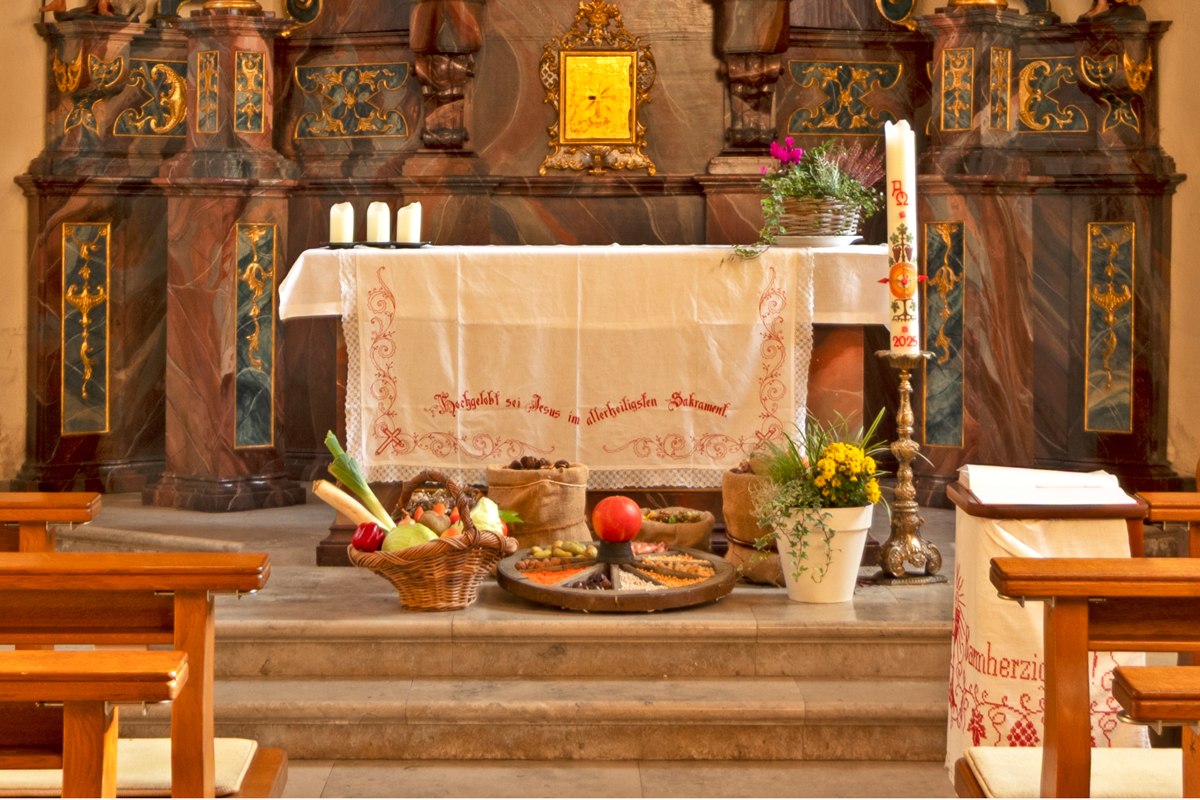 Vor dem Zelebrationsaltar sind Erntegaben ausgestellt, hinter ihm ist der zweistufige Sockel des Hochaltars zu sehen.