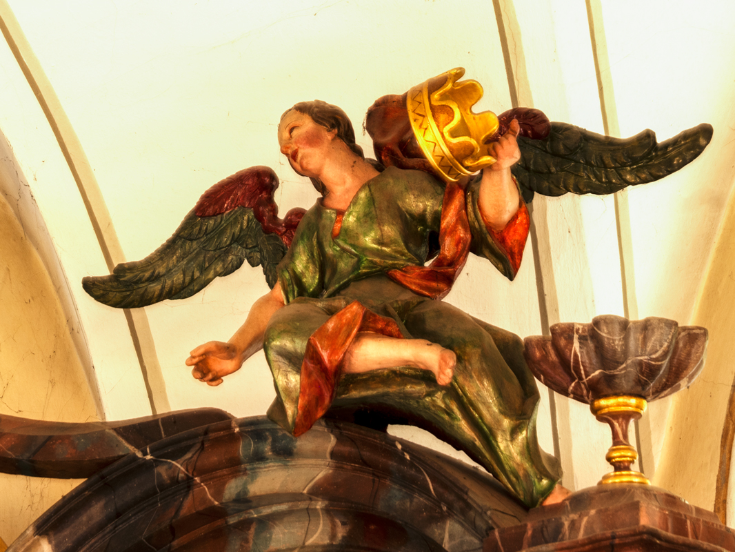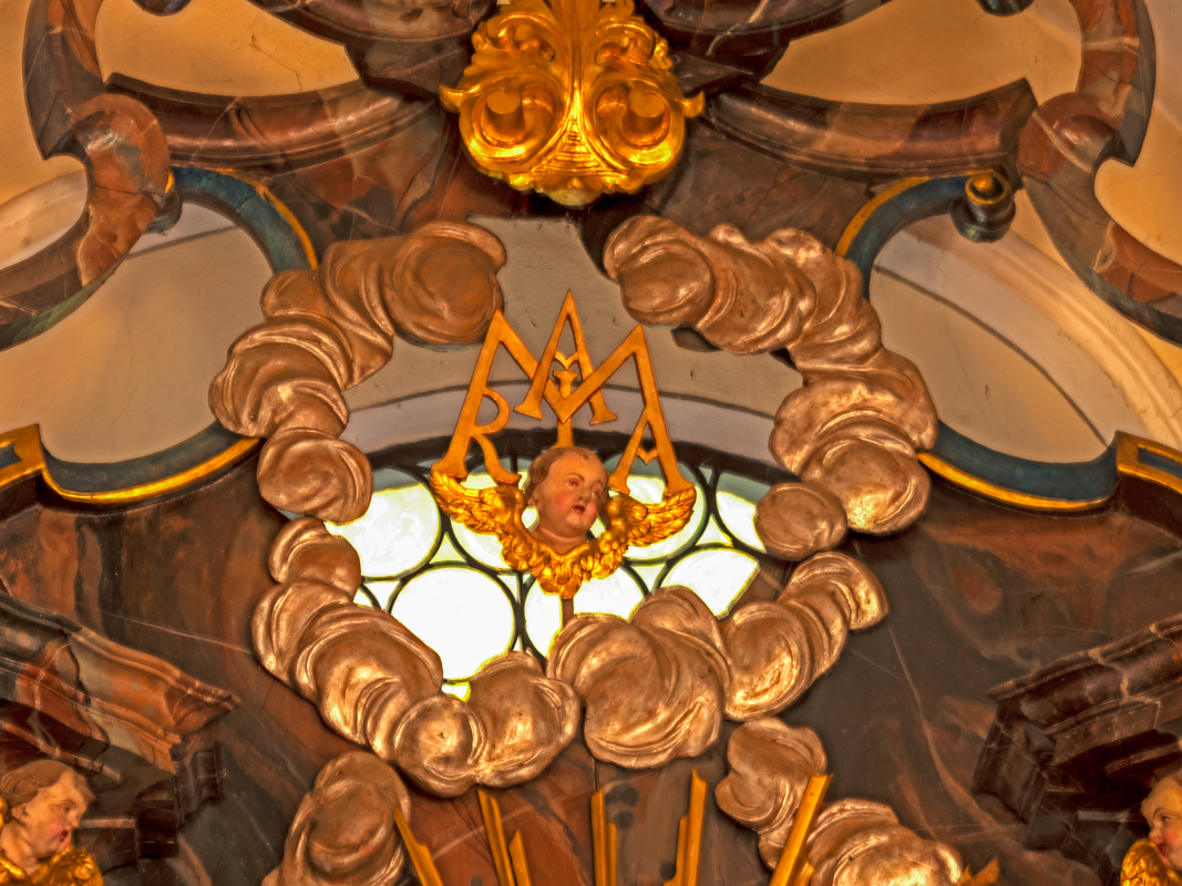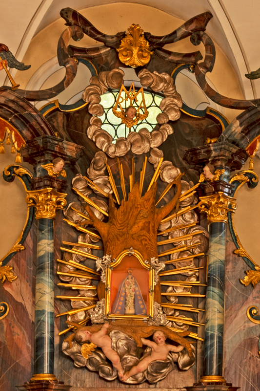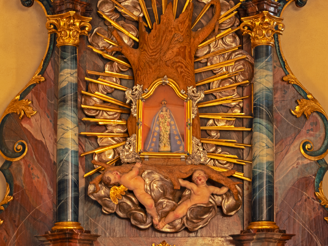 Über dem geschlossen und massiv wirkenden, marmorierten Sockel öffnet sich ein vielräumiger, offener Altaraufbau mit vier korinthischen Säulen. Sie tragen Bögen, von denen geschnitzte Vorhänge herabhängen. Diese Säulenordnung deutet die Schwelle zwischen dem Irdischen und dem Himmlischen an: das künstlerische Symbol einer barocken „Himmelspforte“.